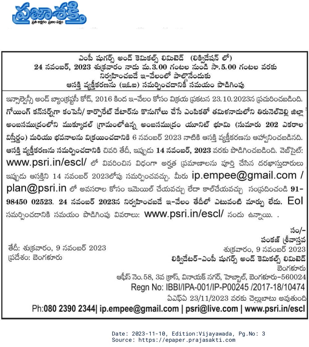 23.10.2023 – Sale Notice for E-auction (under Insolvency and Bankruptcy Code, 2016) Date and Time of E-Auction : 24 Nov, 2023 at 03:00 PM to 05:00 PM | Newspaper Advertisement-23.10.23-English version Newspaper Advertisement-24.10.23-Tamil version Newspaper Advertisement-24.10.23-Telugu version |
