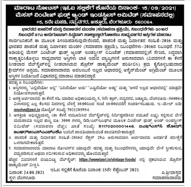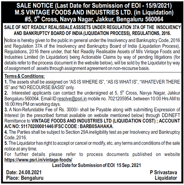 Public Announcement For Sale of Not Readily Realisable Assets-24/08/2021